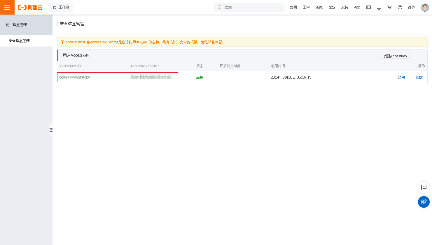 在执行完开启步骤中的第5步获取AccessKey之后