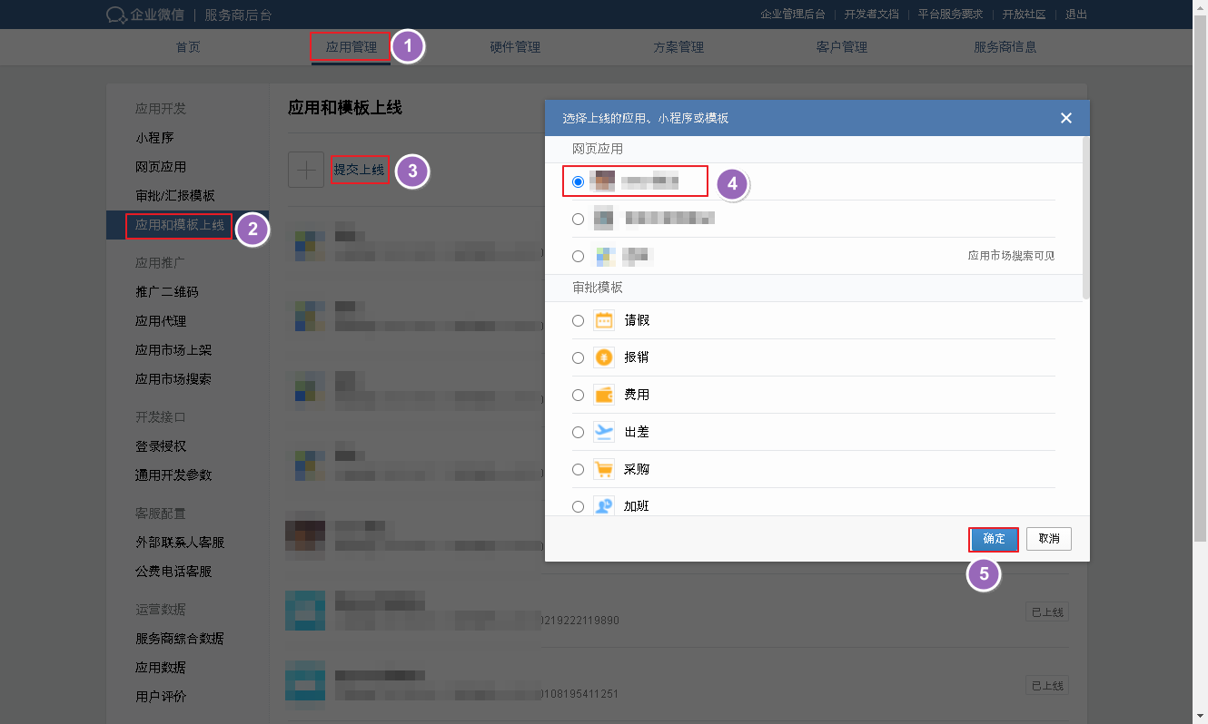 进入【应用管理】->【应用和模板上线】,点击提交上线按钮,耐心等待审核。 提交成功后,等待企业微信审核(约1~2天)。