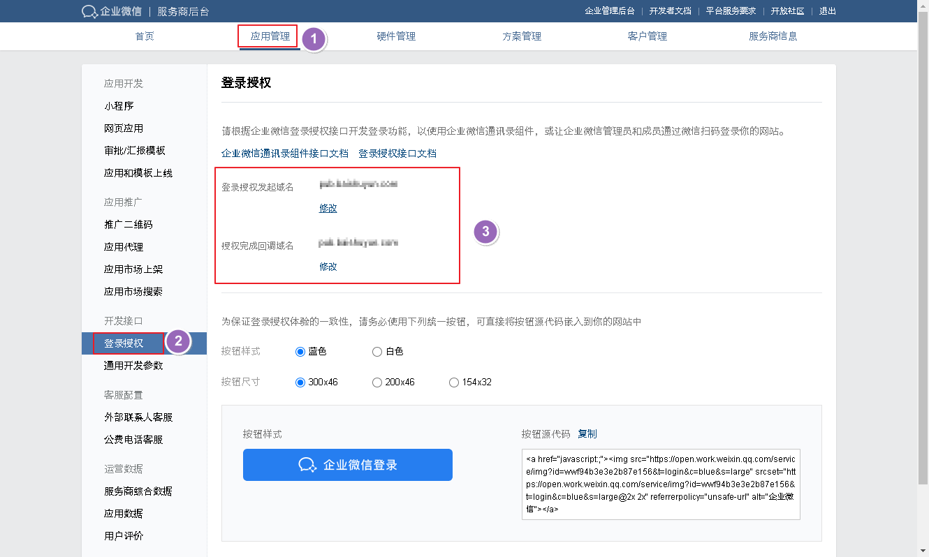 在【应用管理】->【开发接口】->【登录授权】中填写对应的站点域名