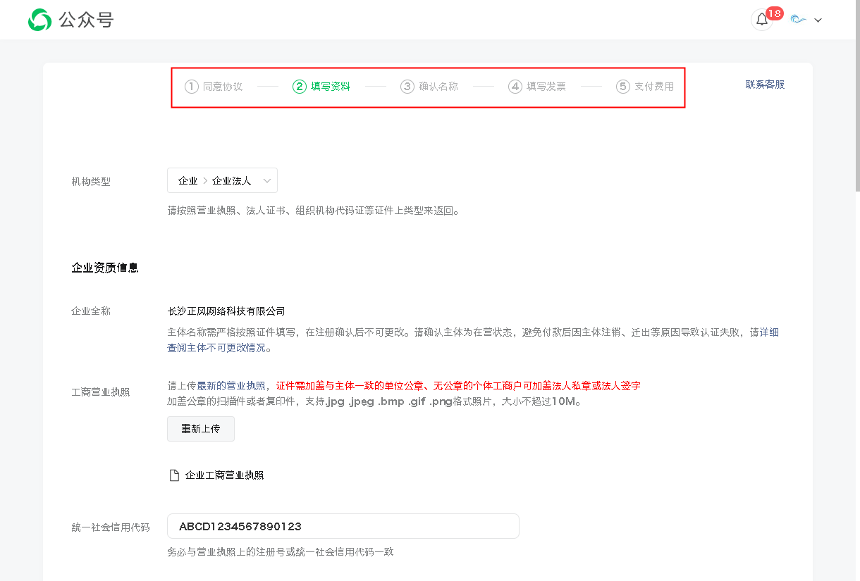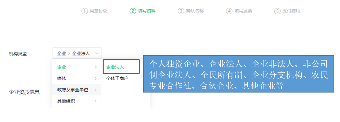 整个认证的流程除了刚才提到的同意协议外,包括填写企业认证资料、确认名称、选择发票、支付费用、等待审核。
