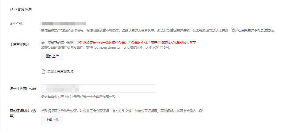 提交企业的资质,填写企业全称、统一社会信用代码,上传工商营业执照和其他证明(选填)