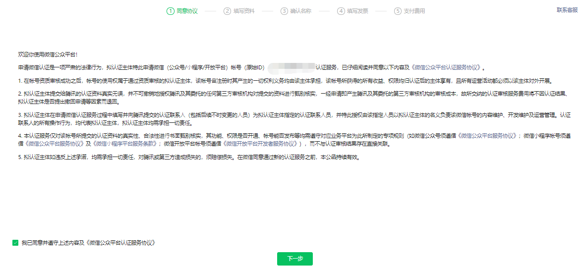 同意协议:签署《微信公众平台认证服务协议》