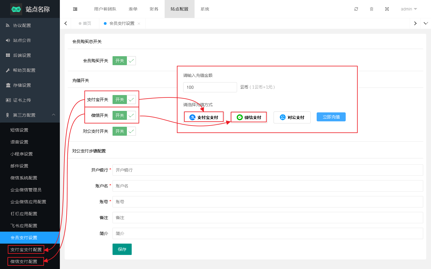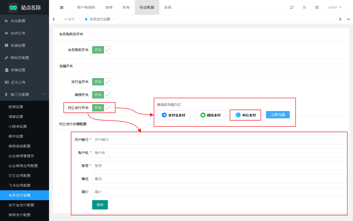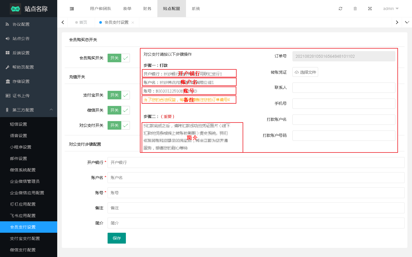 对公支付没有单独的设置页面,对公支付对应的设置项就在当前页面的最下方,需填写开户银行、账户名、账号、备注和简介,设置后即可在前台支付时进行展示,对应关系如下图: