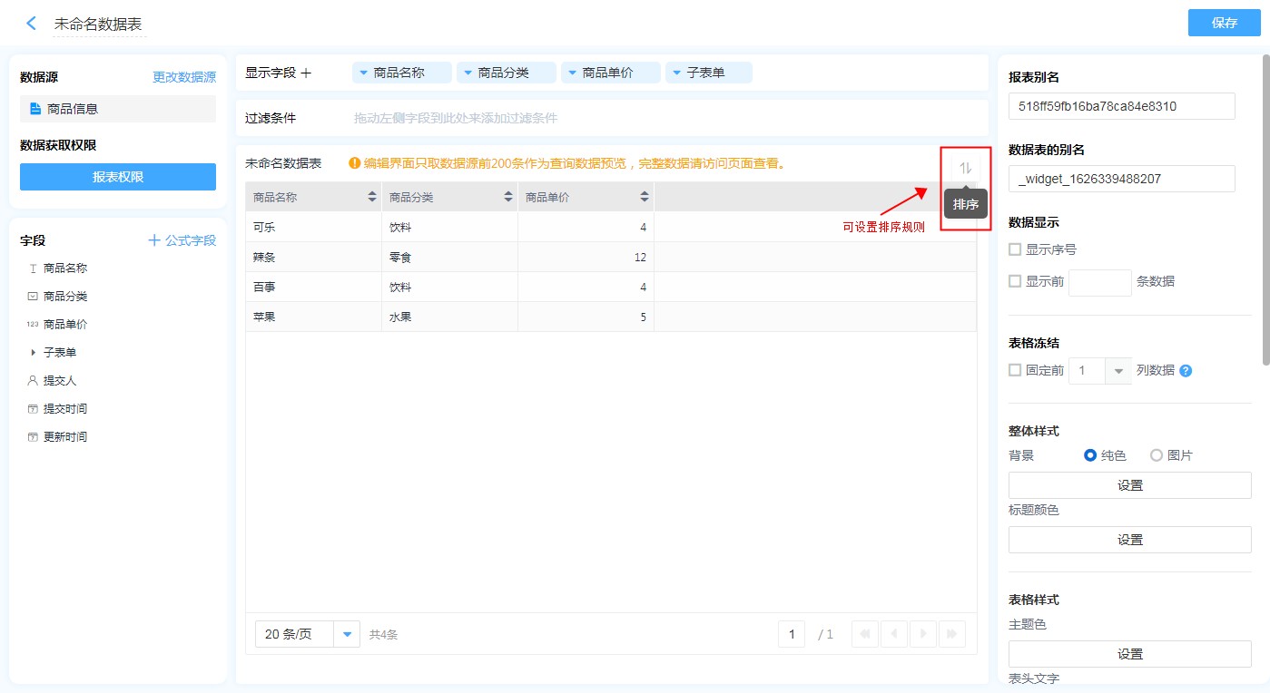 • 数据表排序不支持子表单字段。