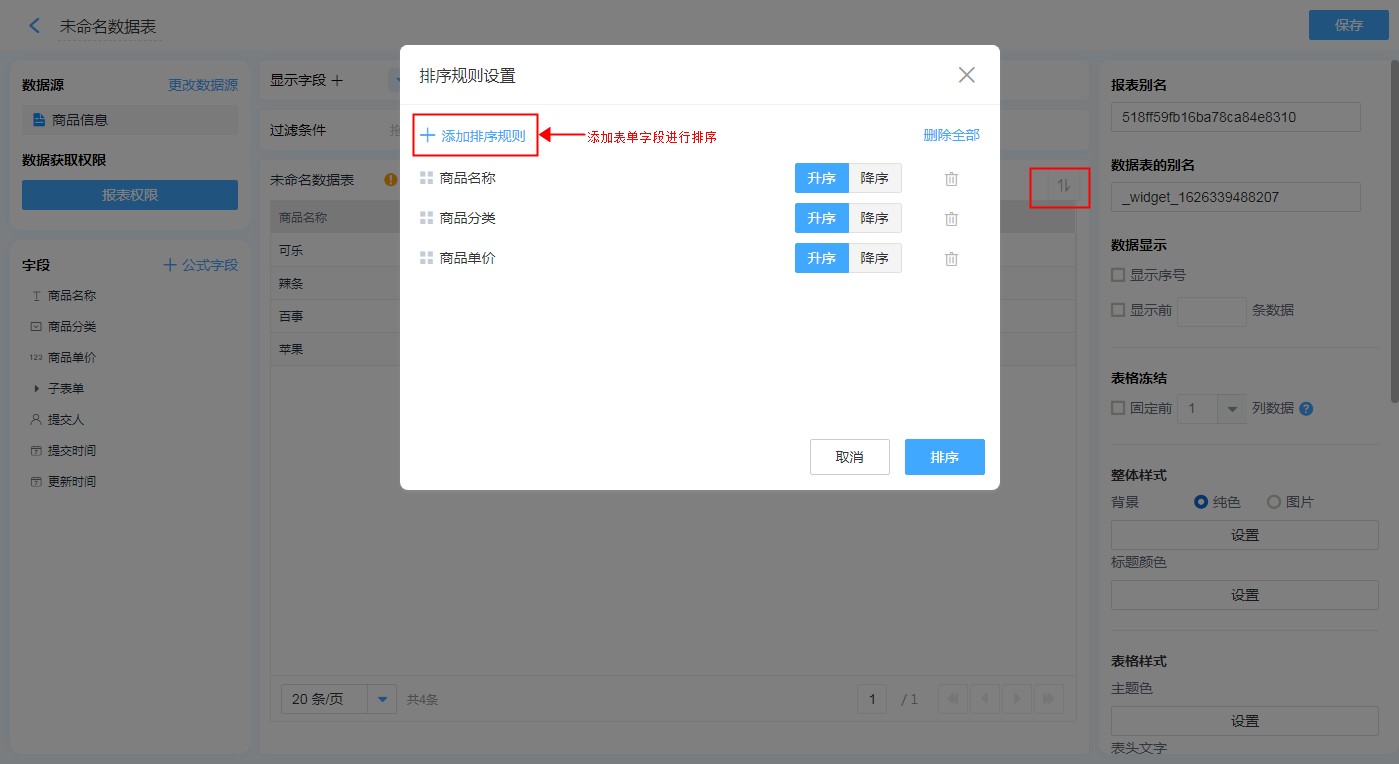 (2)点击 【图表数据展示区】字段列表头快捷地给对应字段设置排序。