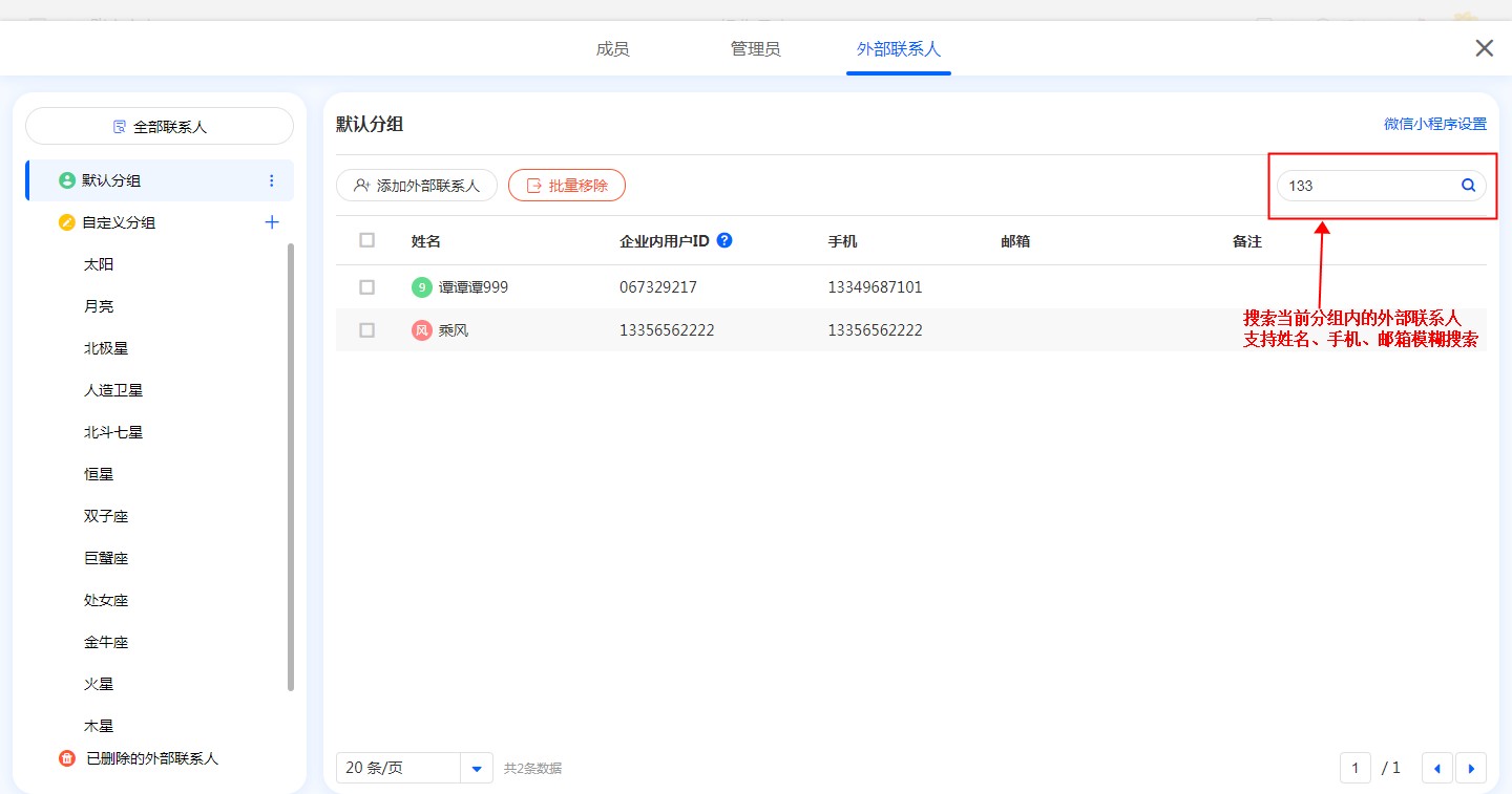 支持对当前分组内的外部联系人,按姓名、手机、邮箱进行模糊搜索。
