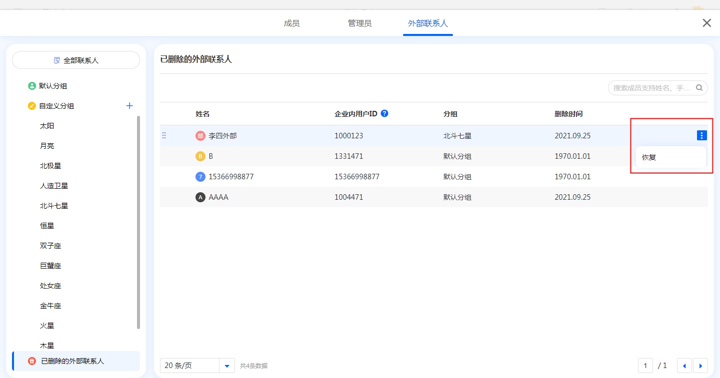 已删除的外部联系人恢复 已删除的外部联系人支持恢复。