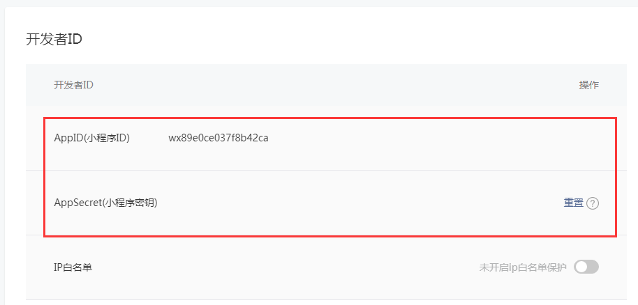 1、在开发者ID里获取到小程序ID和小程序密钥