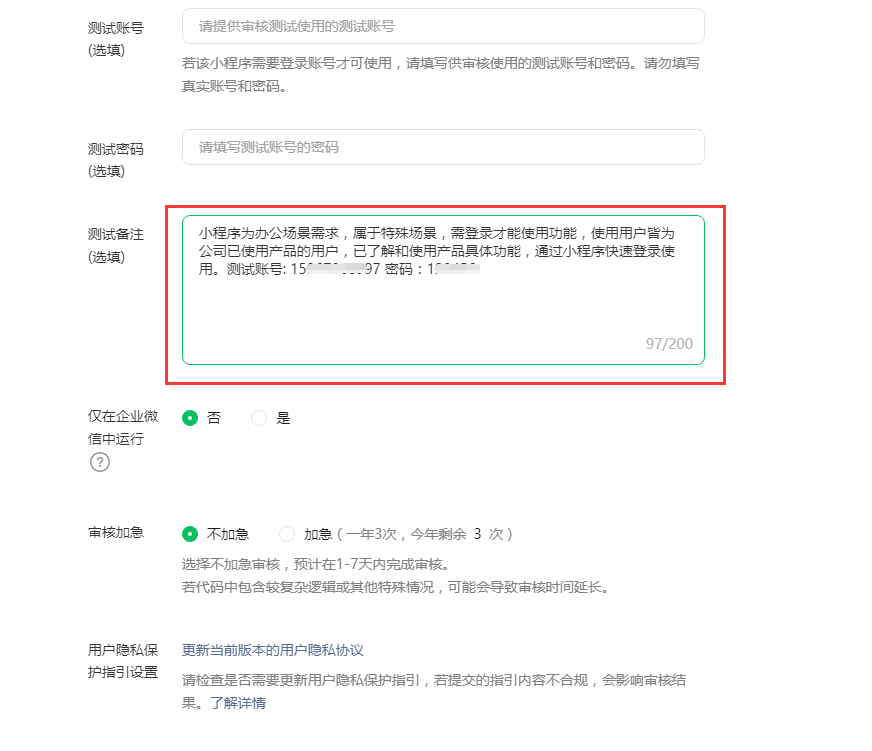小程序为办公场景需求,属于特殊场景,需登录才能使用功能,使用用户皆为公司已使用产品的用户,已了解和使用产品具体功能,通过小程序快速登录使用。测试账号: 132xxxx1234 密码:xxxxxx