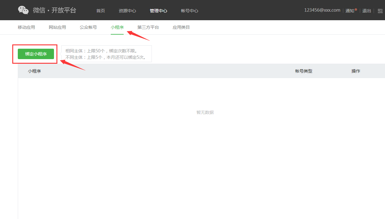 首先需要在微信开放平台登录后,进入管理中心->小程序->绑定小程序->填写小程序账号密码->扫码验权