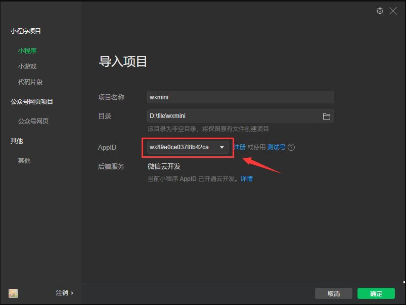 • 点击导入按钮,选择代码文件,并修改APPID为 自己注册的小程序的APPID。