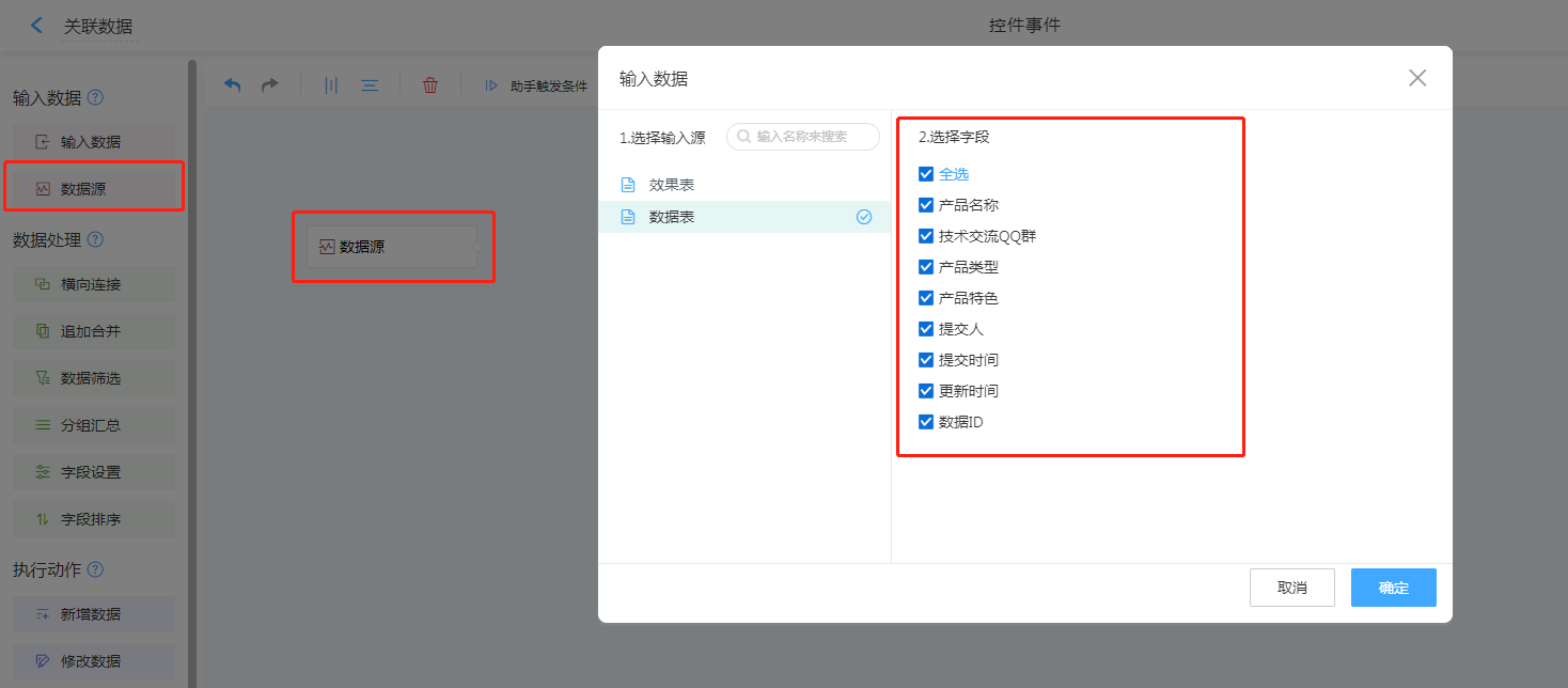 数据源,选择需要调取数据的表单。