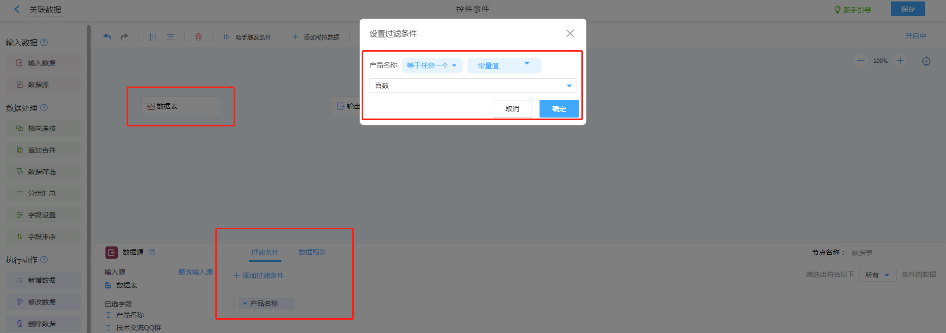 - 设置过滤条件,按照两表之间的关联条件进行设置。
