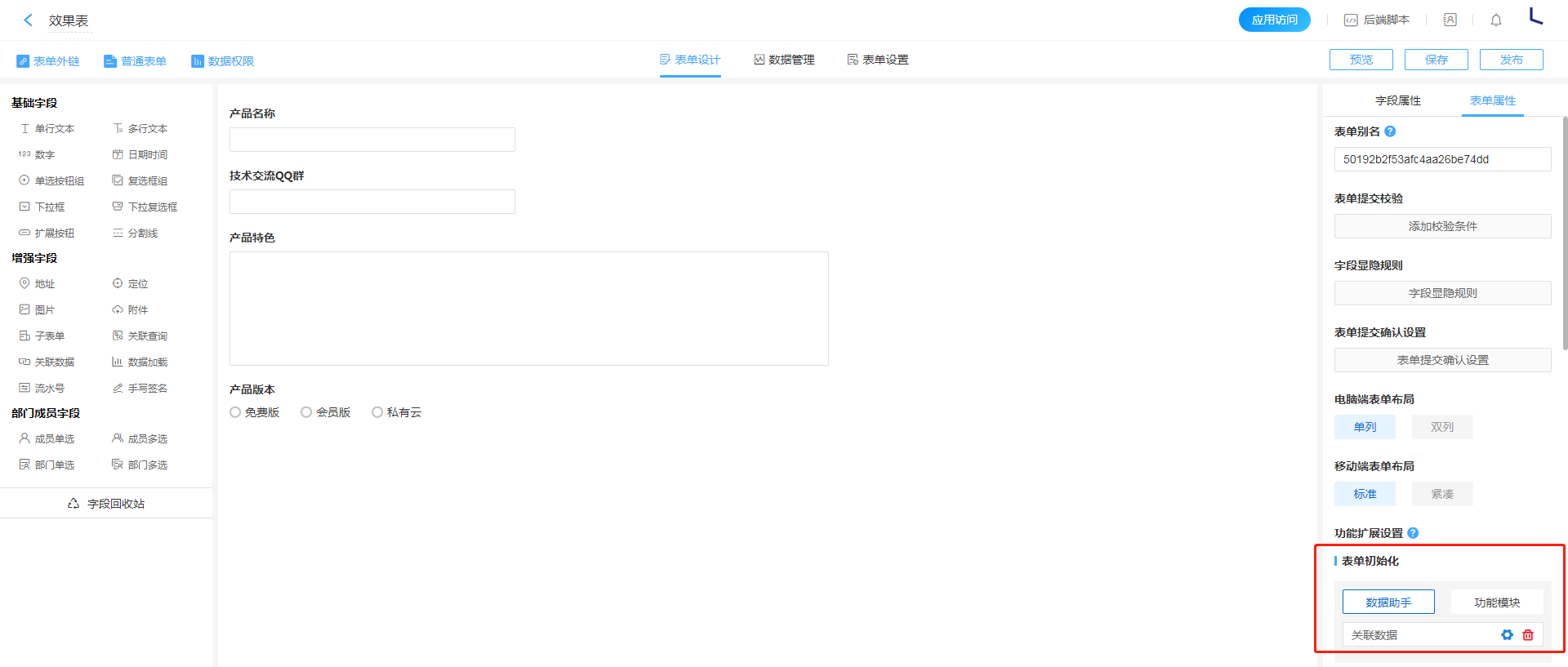 - 进入表单属性的表单初始化数据助手配置页面。