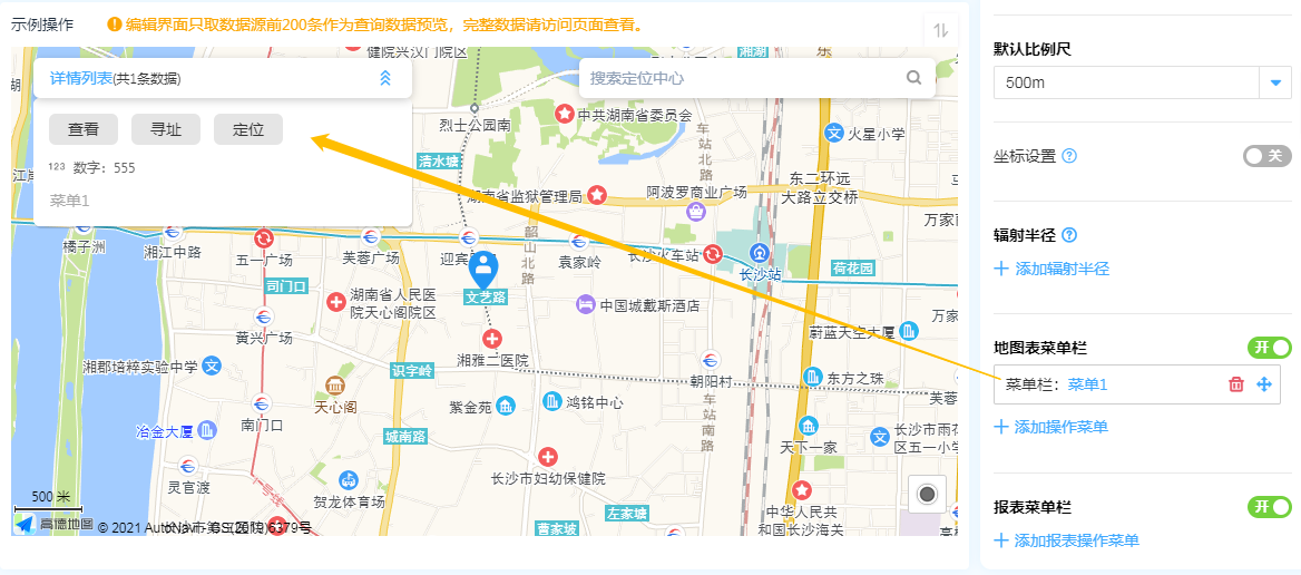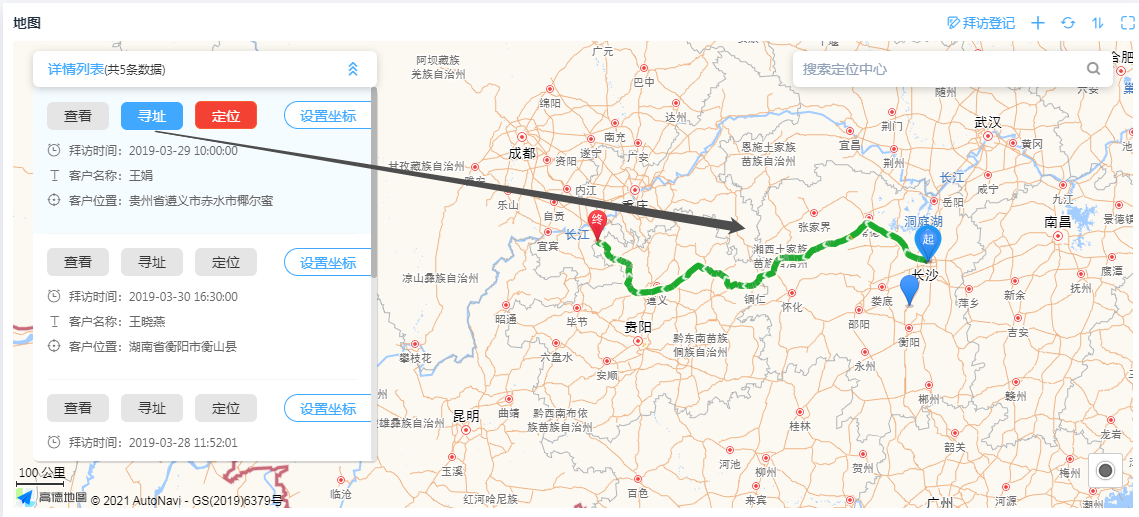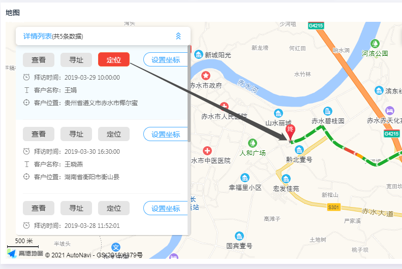提交后的客户信息将在地图场景报表中以列表的样式呈现,重要信息一目了然。点击查看可以还原表单信息,寻址能够显示距离路线,定位能够在地图上标记具体位置。
