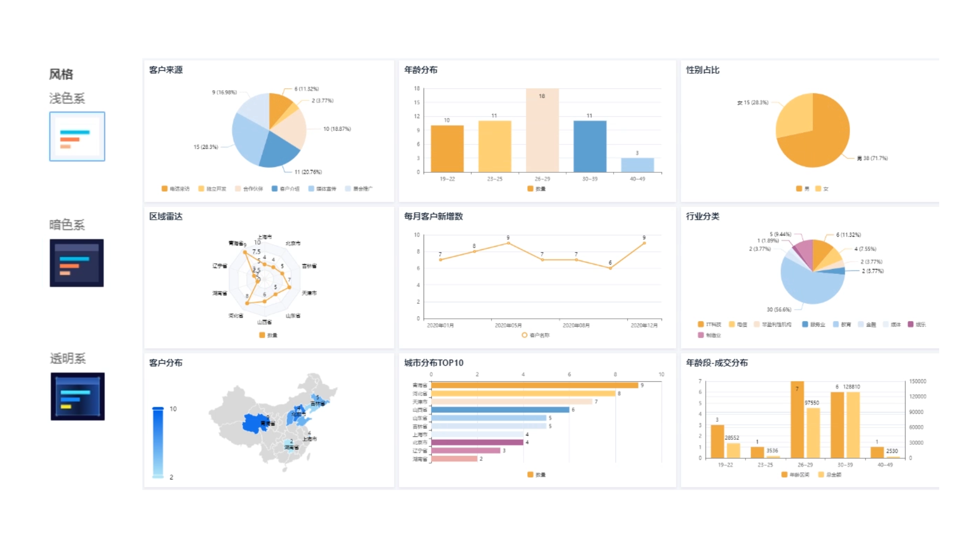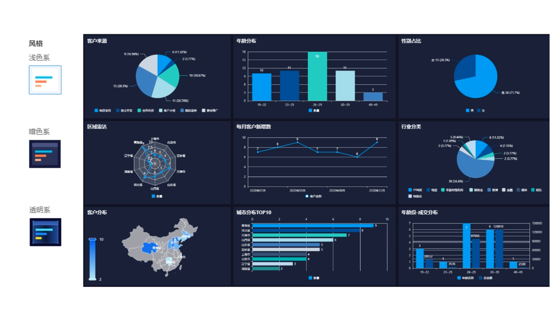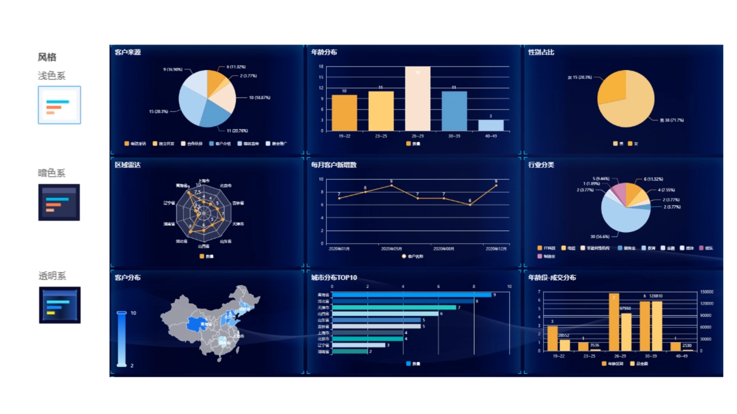 可对现有报表进行编辑,通过分析报表整体样式设置可以快速完成仪表盘视觉风格的转换。市面上酷炫的报表看板制作过程较为复杂,而凌云不仅对于单个组件的特殊展示需求支持单独配置,也支持快捷设置报表整体风格,风格一键即可切换。