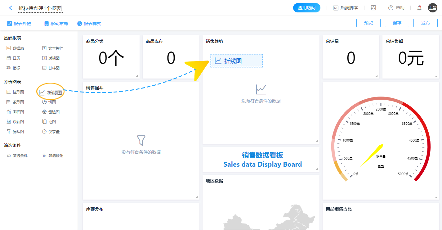 凌云提供多样化图表、控件、表格等组件,不必预先导入数据,用户可以直接直接将所要呈现的组件拖拽到画布上进行自由配置和布局,通过简单的点击拖拽即可生成可视化页面,不写一行代码就能轻松编辑操作,让懂业务的人自己完成分析。