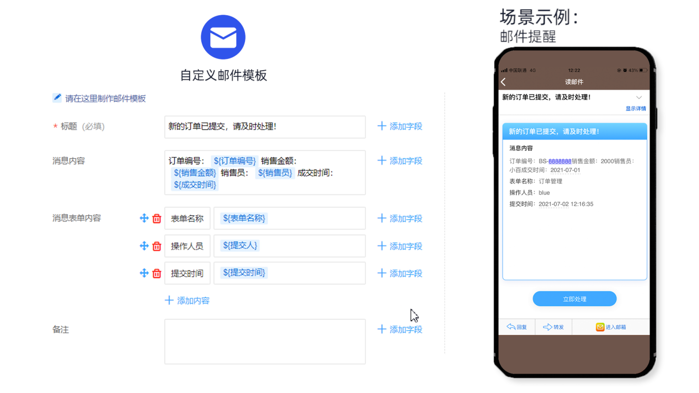 而凌云的「推送提醒」功能可以在满足提交条件之后,将需要提醒的数据,使用指定推送渠道发送给指定被提醒人相应的提醒信息,让消息提醒更准确、及时、直观地送达被提醒人并进行处理,使消息与业务直接挂钩。