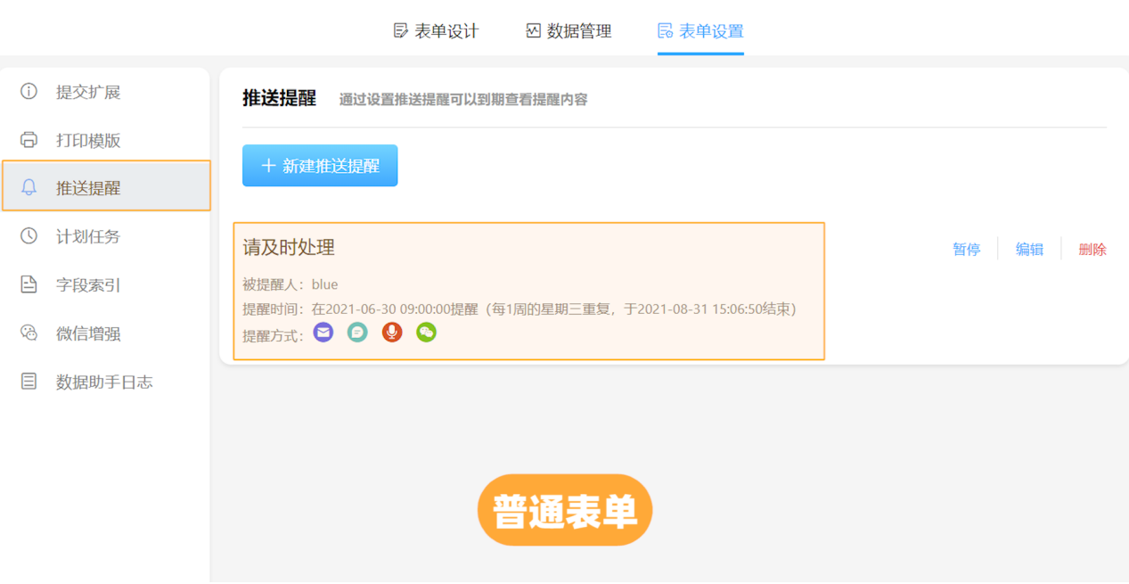 「推送提醒」在表单、流程表单、数据助手三个入口均可进行设定,以便于用户在不同的业务场景下及时处理任务以及了解最新情况;