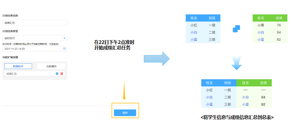 以家校管理中的学生成绩汇总为例,学生每个学期不同类型考试的成绩汇总,需要操作大量的数据表单,在凌云通过计划任务功能配合数据助手,能够有效为老师减负。