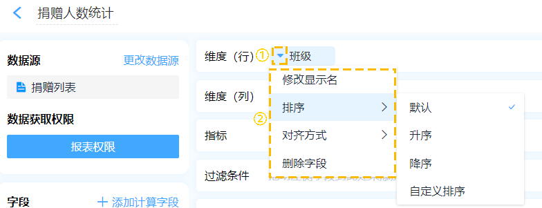 对于维度字段,还可以进一步设置显示名、仅详情显示、汇总方式、数据格式、排序、对齐方式等。根据指标和维度,设置不同的汇总统计方式,可以得到不同的汇总结果。