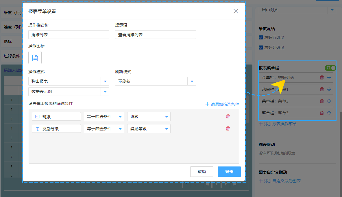 在报表的表头上方,也支持添加自定义按钮,可对接数据助手或者弹出表单、报表,当有多个报表需要同时查看编辑时方便快速切换处理。
