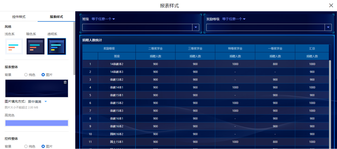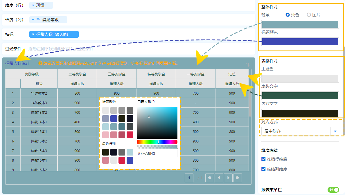 透视图支持样式自定义,可自定义的包括: 整体样式 整体报表的风格,主要设置背景颜色/图片、标题颜色 表格样式 数据内部文字的颜色、表头的显示颜色以及对齐方式等