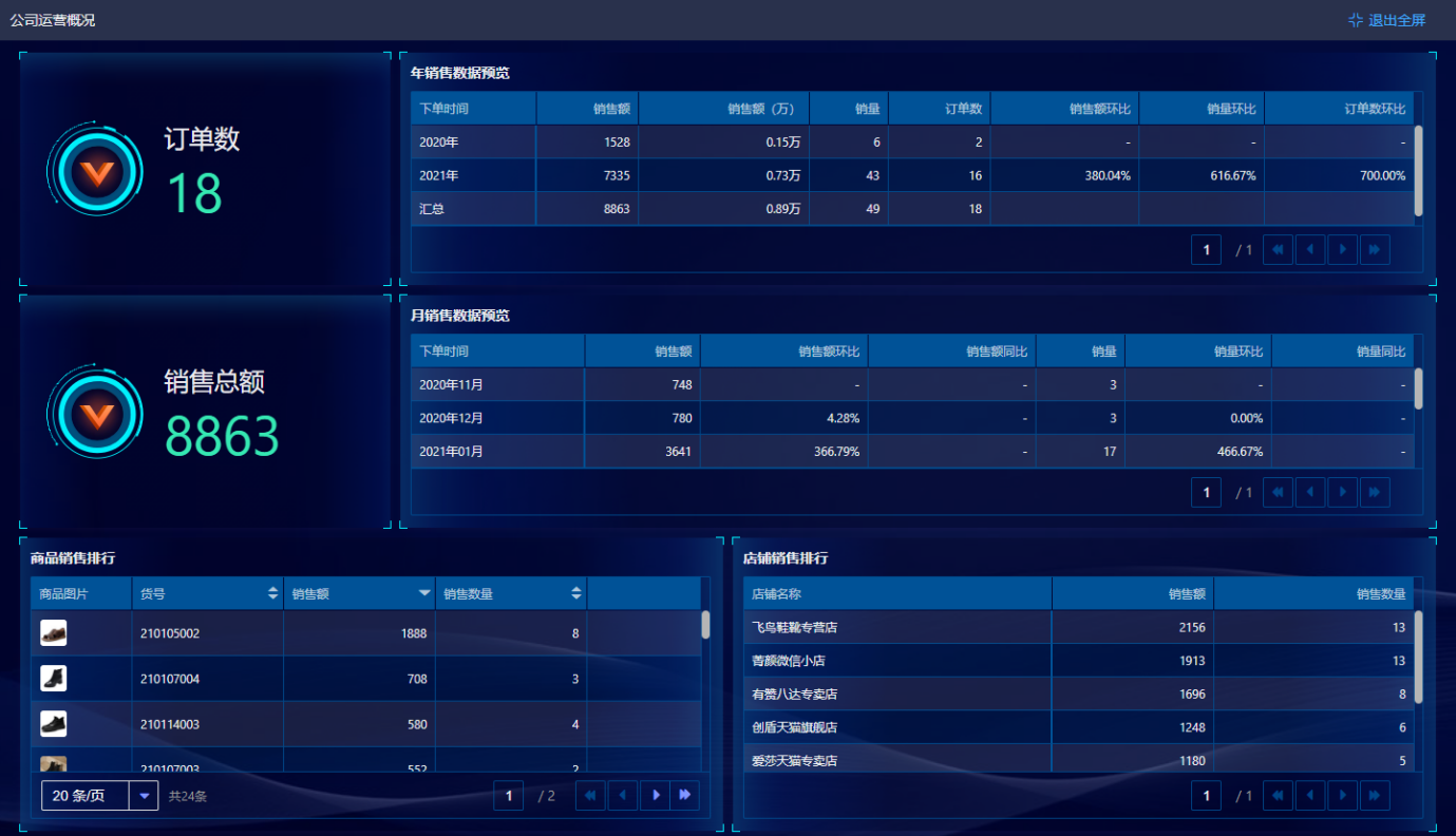 · 店铺销售详情中对销售额、销售环比、销售额同比、销量、销量环比、销量同比等几个关键数据汇总和分析