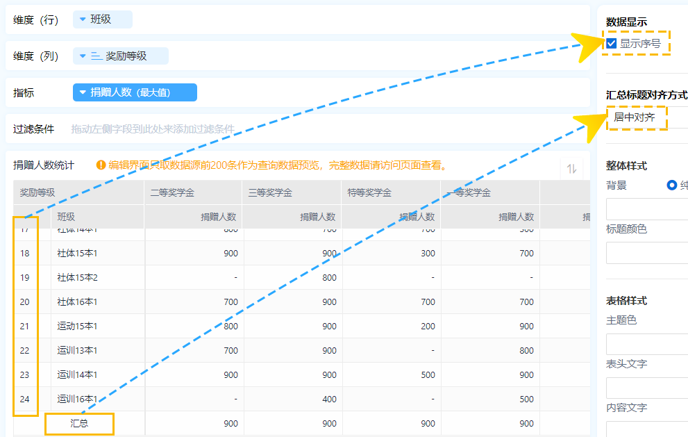 对于透视图也可以设置当前数据表是否显示序号、汇总标题对齐方式。如在姓名前面设置显示序号,同时将捐赠人数按照降序展示,即可得到不同班级的学生捐赠人数排名。