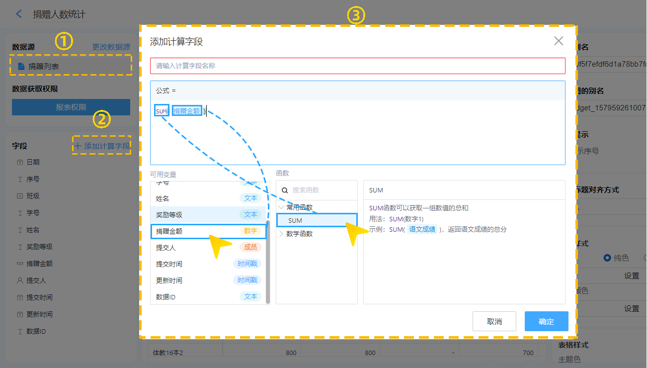 在统计之前,需要先录入好数据。选择需要统计的数据源表单进行透视图汇总统计,如:表单、数据视图中的数据。不需要复杂的函数,通过增加公式字段,对报表中显示的内容只要动动鼠标就能轻松求和、计数、平均值、最大值、最小值、排名、百分比、环比、同比等计算处理。