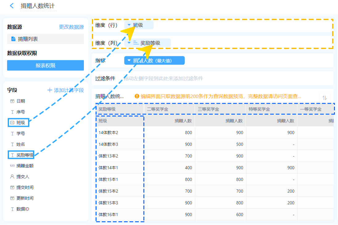 从字段区域选择需要汇总统计的字段拖动到维度区域,即根据什么进行汇总。透视图的行和列都可以设置多维度分析,维度越大,数据越详细。