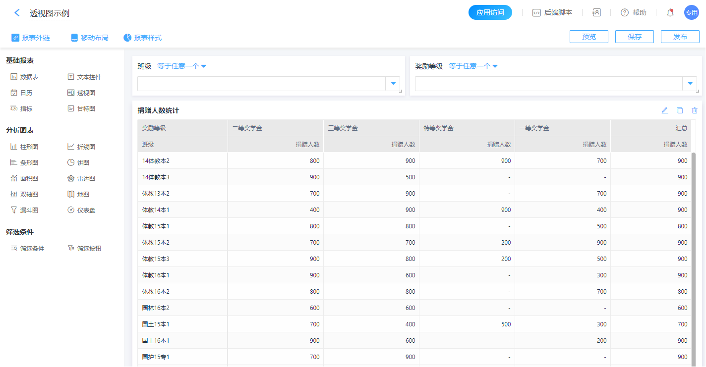 透视图通过统计对比,把表格的数据用图形形式直观的展现出来,适合对数据进行汇总和分析的业务场景,如: