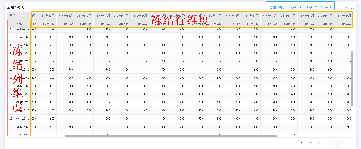 当汇总表数据量过多,在横向/纵向滚动时可使用维度冻结功能,冻结汇总表的头部菜单,方便对应头部菜单进行数据查看。