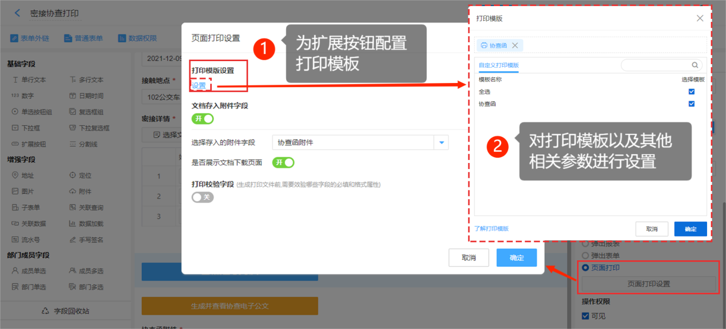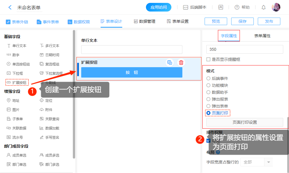 1.首先在表单页面中创建一个扩展按钮,将扩展按钮的属性设置为页面打印,并对打印模板以及其他相关参数进行设置,可以在当前页面直接进行页面数据的打印。