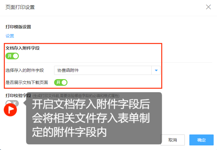 2.开启文档存入附件字段开关,开启后会将相关文件存入表单制定的附件字段内。