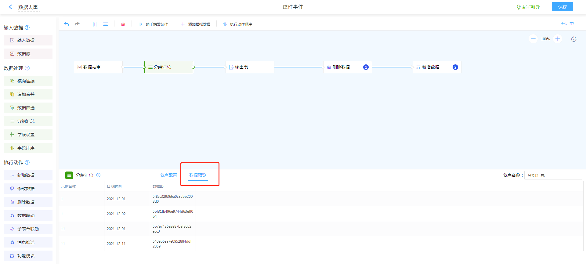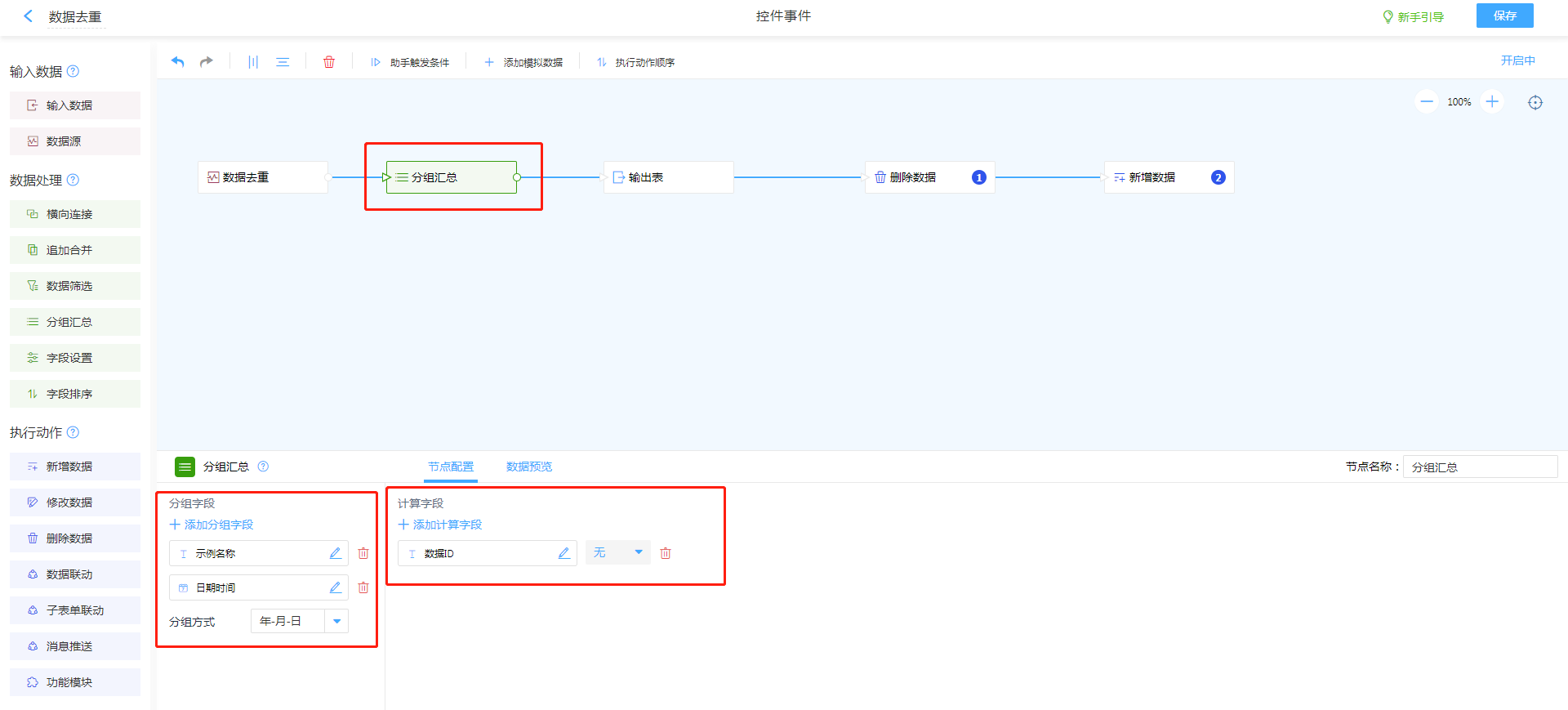 • 例如:本案例需要根据示例名称与日期时间进行去重(既全字段去重),那么需要将两个字段加入分组字段,并在计算字段值加入数据ID。