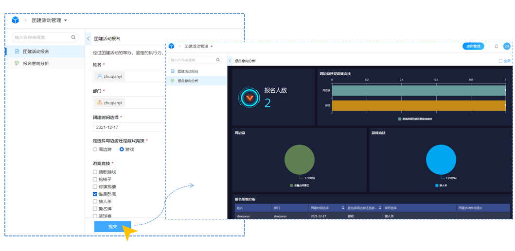 | 图示效果为团建申请提交后自动跳转到统计表 |