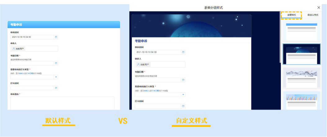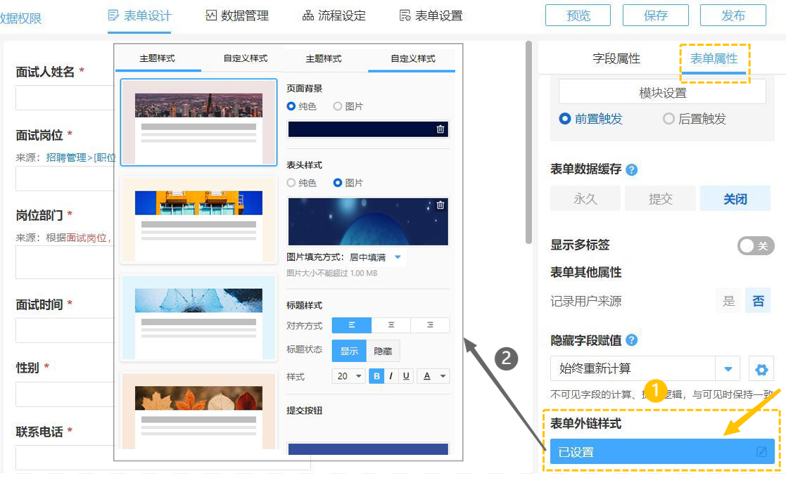 每个企业都有自己的品牌标识,通过表单设计>>表单属性>>表单外链样式的个性化设置,可以从第一视觉观感上树立品牌形象。凌云不仅提供了20多套主题样式可供选择使用,也可以由你自定义外链样式,借助视觉效果来更好的提升品牌辨识度。