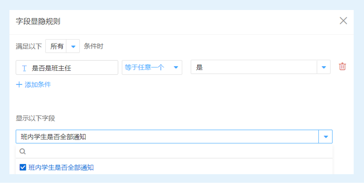 设置好条件以后,需要设置显示字段。即满足上述条件后需要显示的字段,也就是不满足条件不显示的字段。如,学校假期期间行程调查场景中,老师选择「是」班主任后,设置显示字段让老师选择是否通知了班内全部学生。