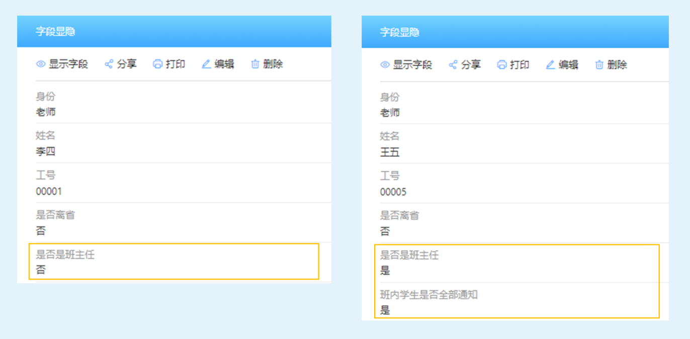 我们以学校放假安排调查场景为例,如学生需填写:「姓名」、「学号」、「是否离省」等字段;而老师除了填写:「姓名」、「工号」、「是否离省」外,还需要填写「是否是班主任」等字段。我们便可以通过字段显隐规则,设置在老师身份下显示「是否是班主任」等字段,而学生身份下隐藏。