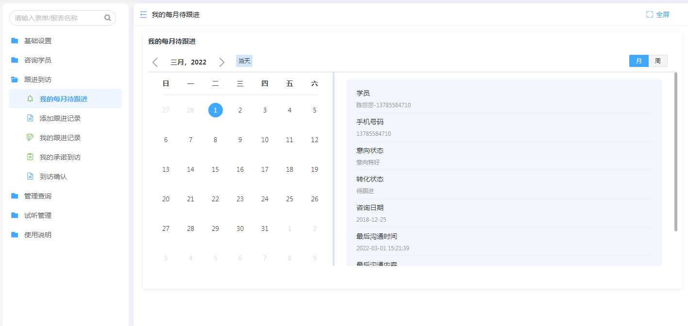 借助日历报表的样式可以方便招生老师快速确认近期跟进工作安排,减少工作遗漏。