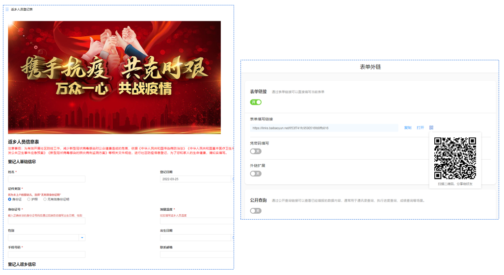 用于记录个人基本信息、返乡交通方式、旅居史等信息。电子表单可生成表单链接或二维码,方便移动端填写登记。
