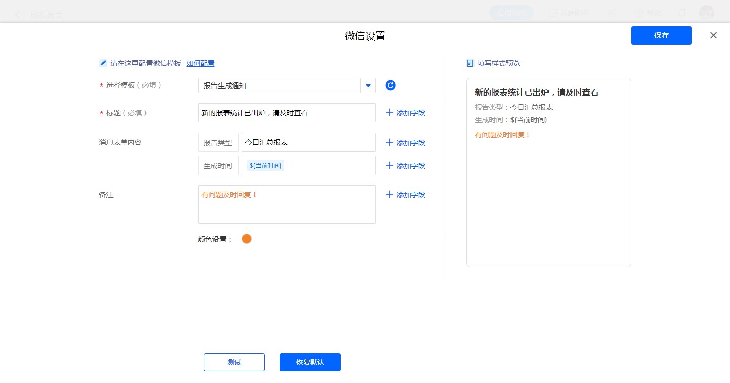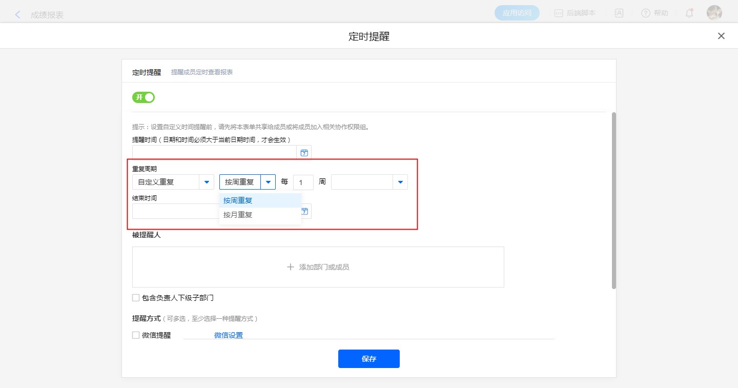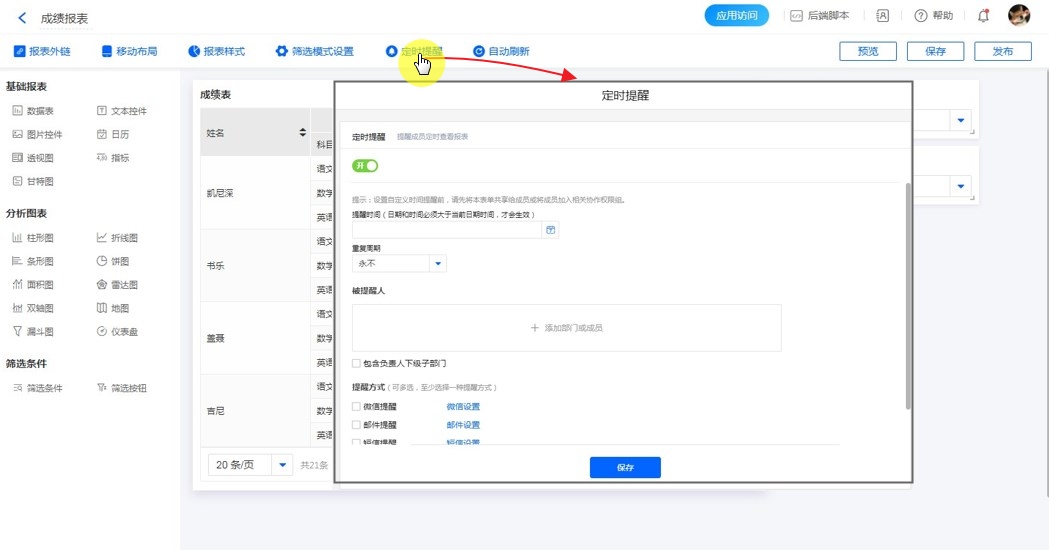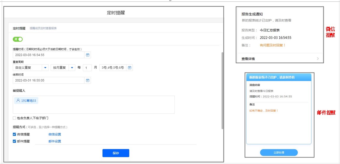 如图所示,设置报表定时提醒,时间达到后,会根据选择的提醒方式发送消息给被提醒人。