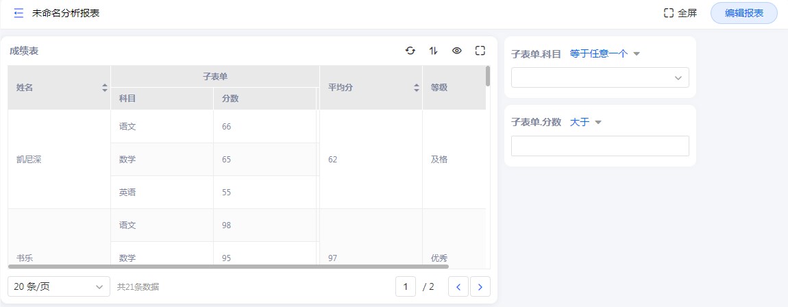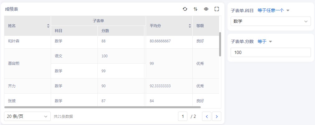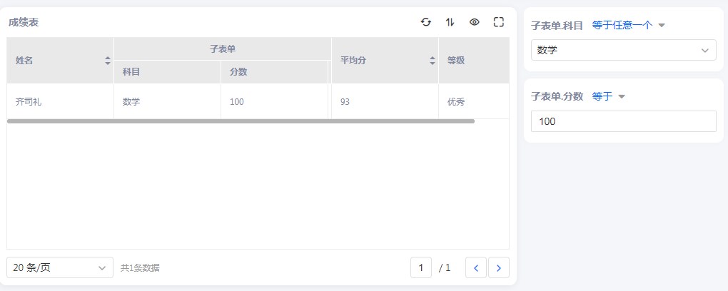 • 设置满足所有条件,查询科目等于数学,且分数等于100的数据。查询结果如下: