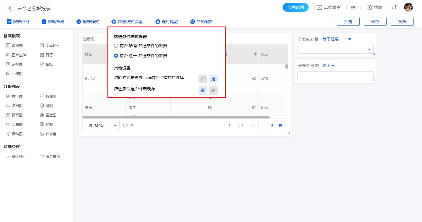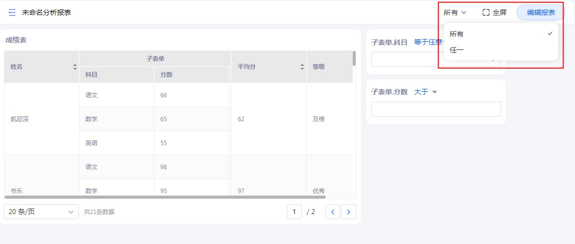 支持2种筛选模式:筛选出满足所有/任一筛选条件的数据。