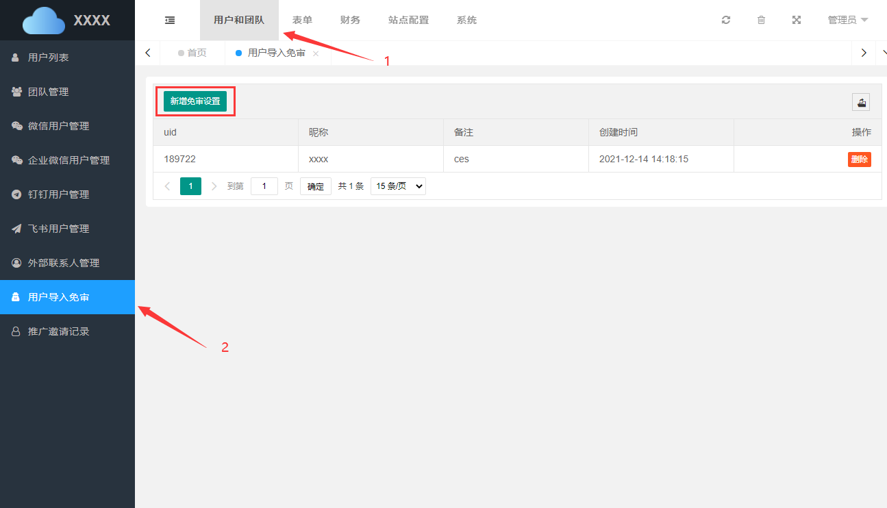 新增免审设置时导入免审需要指定团队创建者的UID,UID可在用户列表查看。