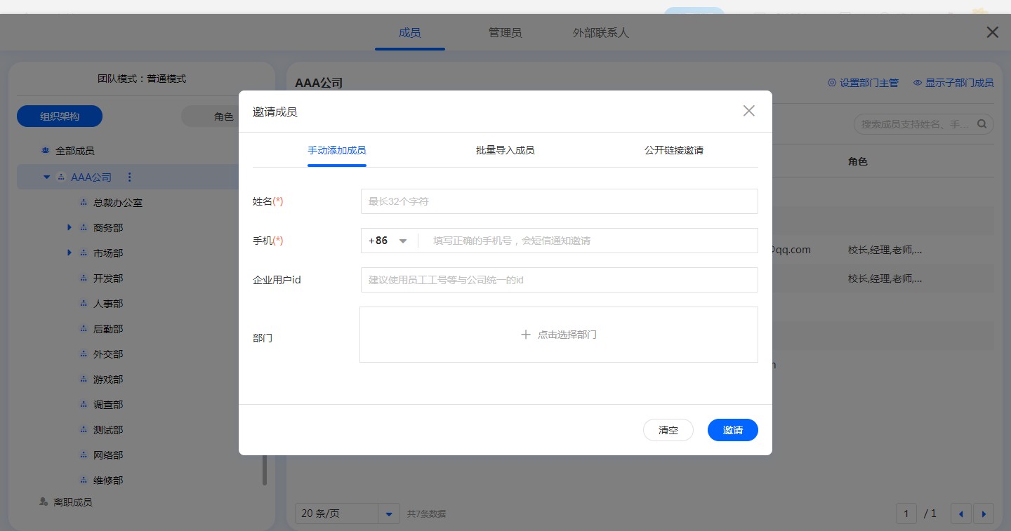点击邀请成员->选择手动添加成员