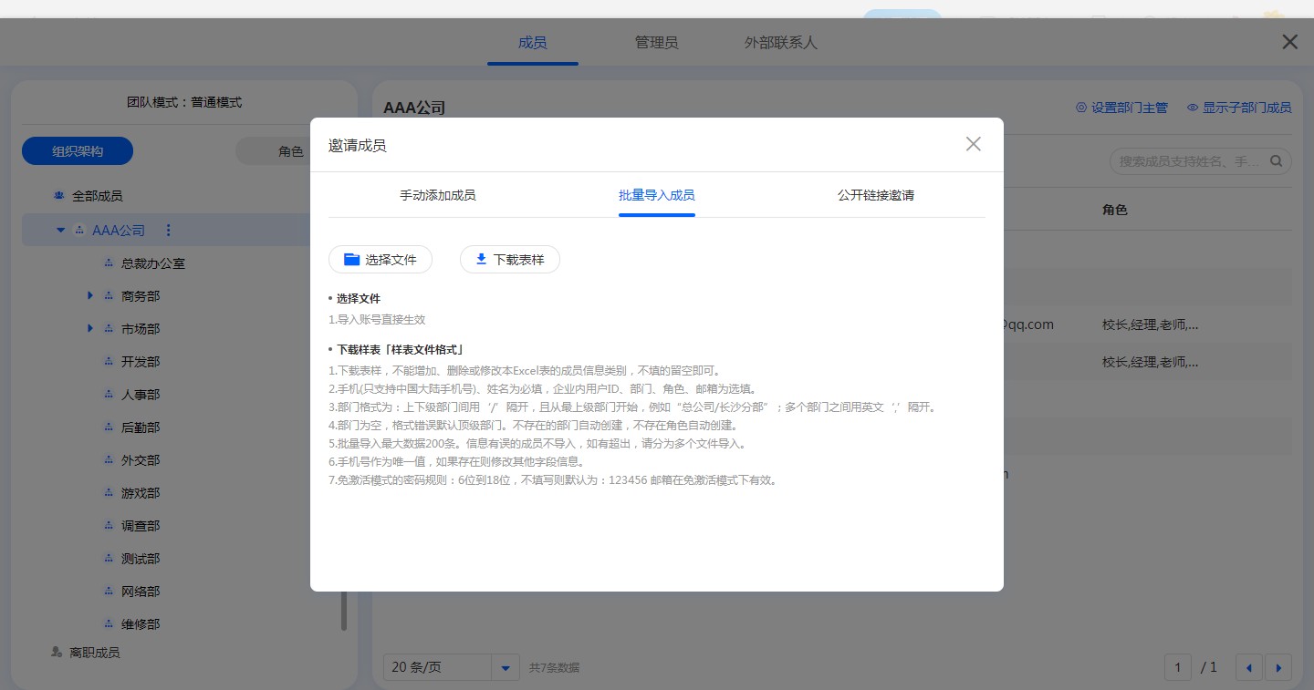 批量导入成员前需下载表样,按表样进行填写,完成后点击【选择文件】进行导入。