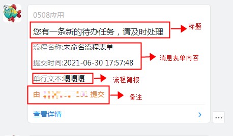 • 系统为流程表单的提交、回退、转交、催办、抄送五种场景类型设置了默认的消息模板。