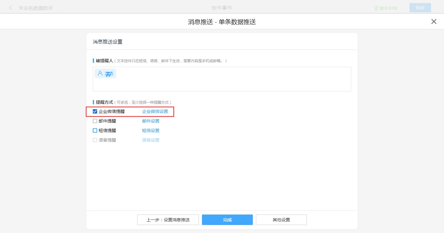 【普通表单设计】-【表单设置】-【消息推送】-【新建消息推送】-【企业微信提醒,企业微信设置】